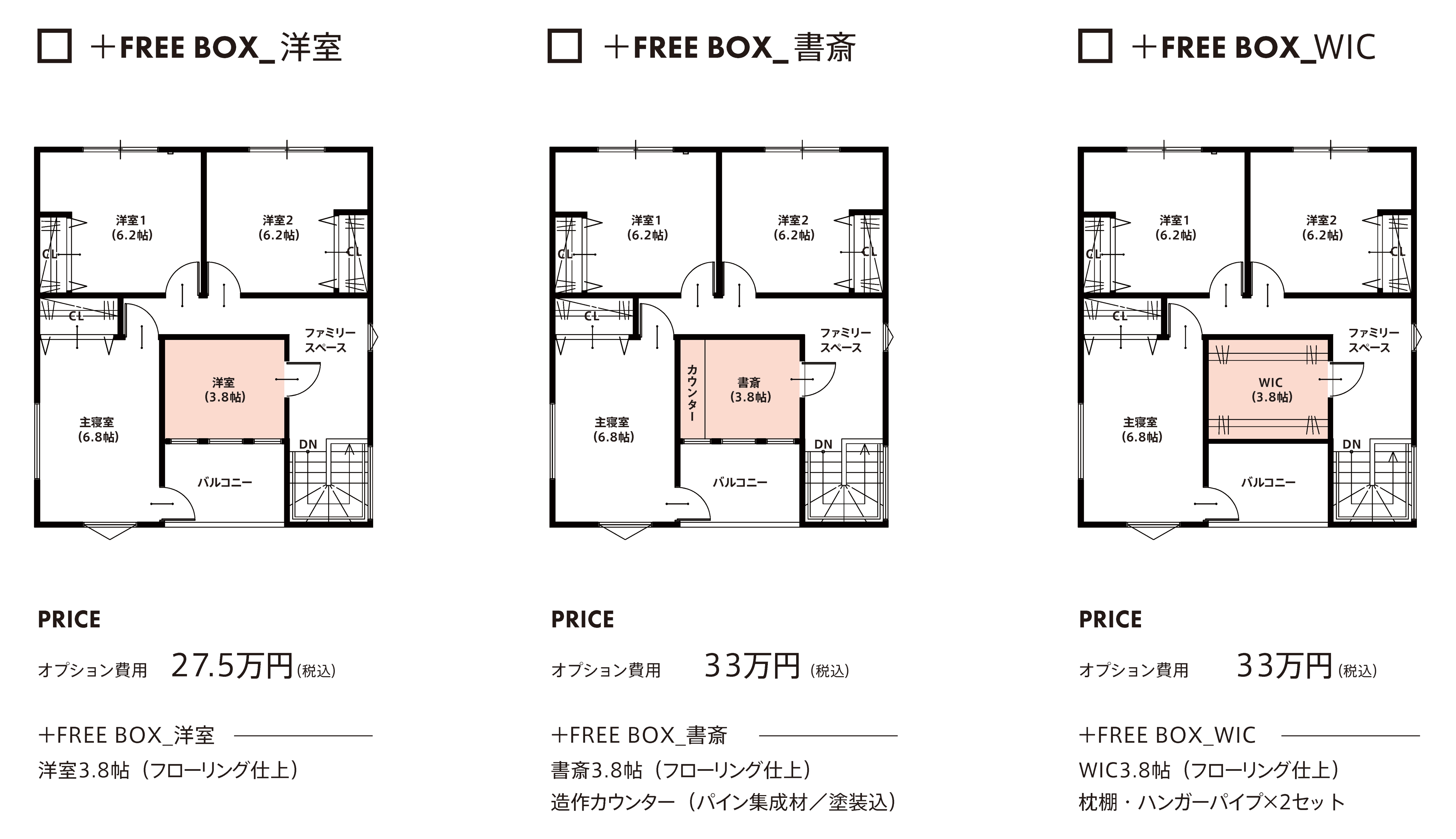 | 2階のオプション間取り | + FREE BOX1(洋室), + FREE BOX2(書斎), + FREE BOX3(WIC) |
