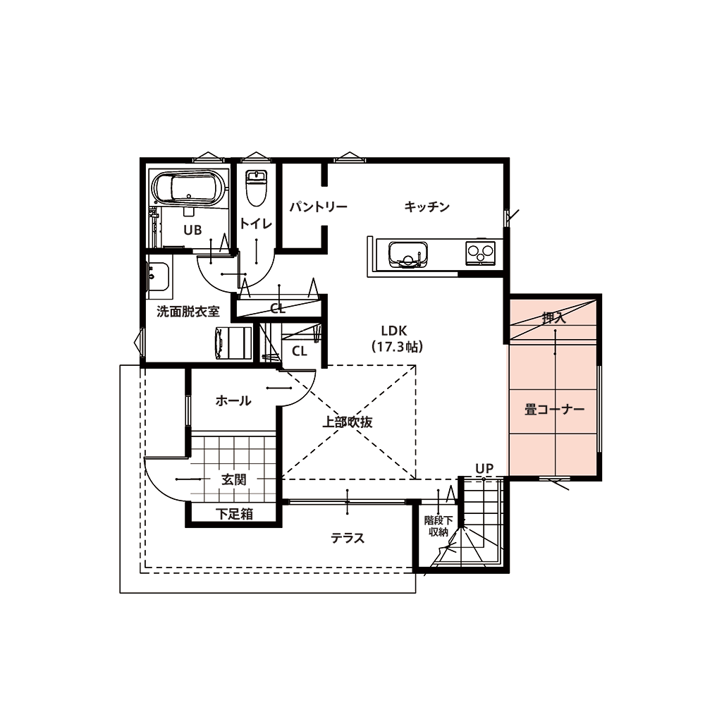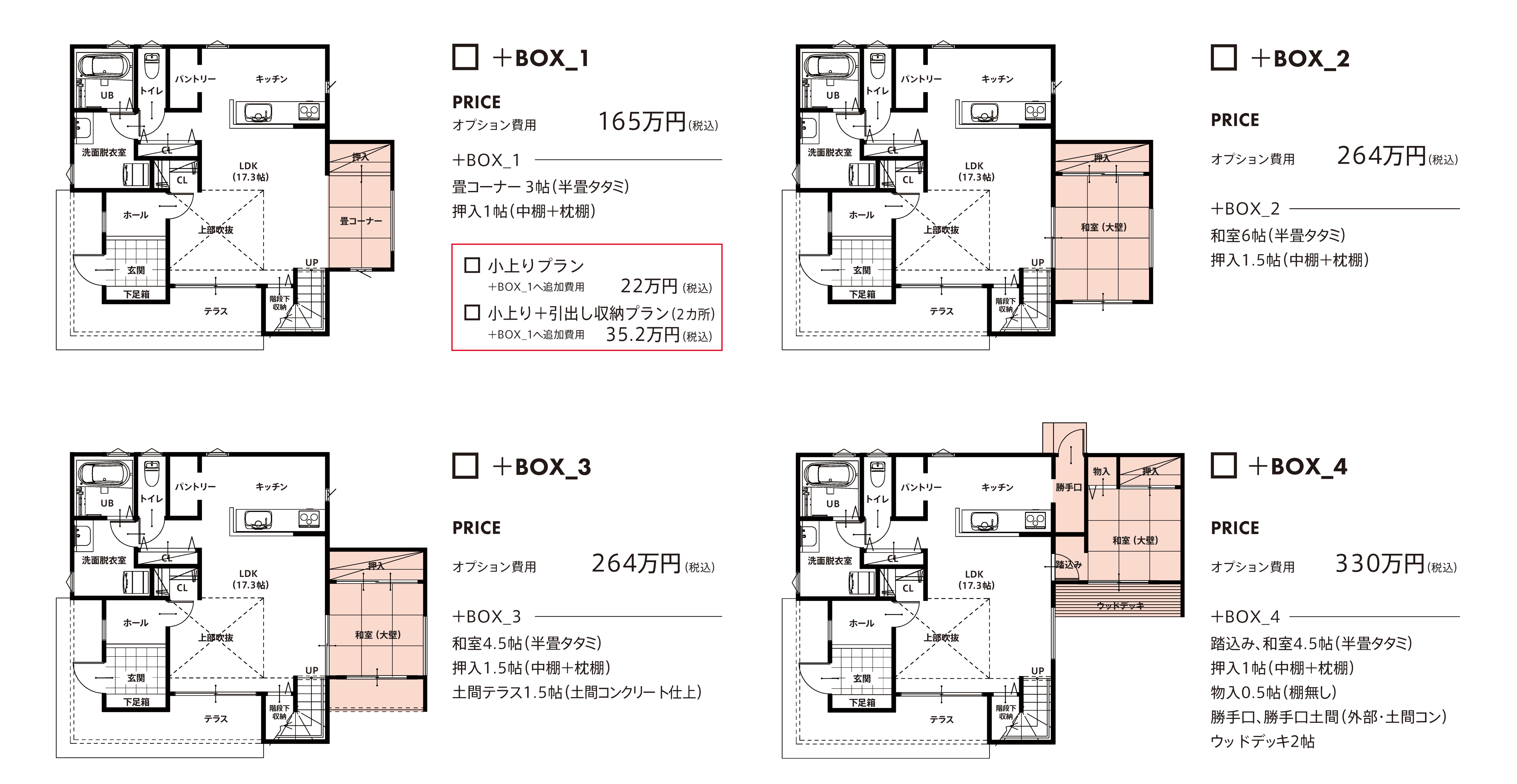 | 1階のオプション間取り | +BOX_1(畳コーナー3帖), +BOX_1(畳コーナー3帖 + 小上がり), +BOX_1(畳コーナー3帖 + 小上がり + 引出収納), +BOX_3(畳コーナー4.5帖 + 土間テラス), +BOX_4(畳コーナー4.5帖 + ウッドデッキ + 勝手口), +BOX_2(畳コーナー6帖), 選択しない |